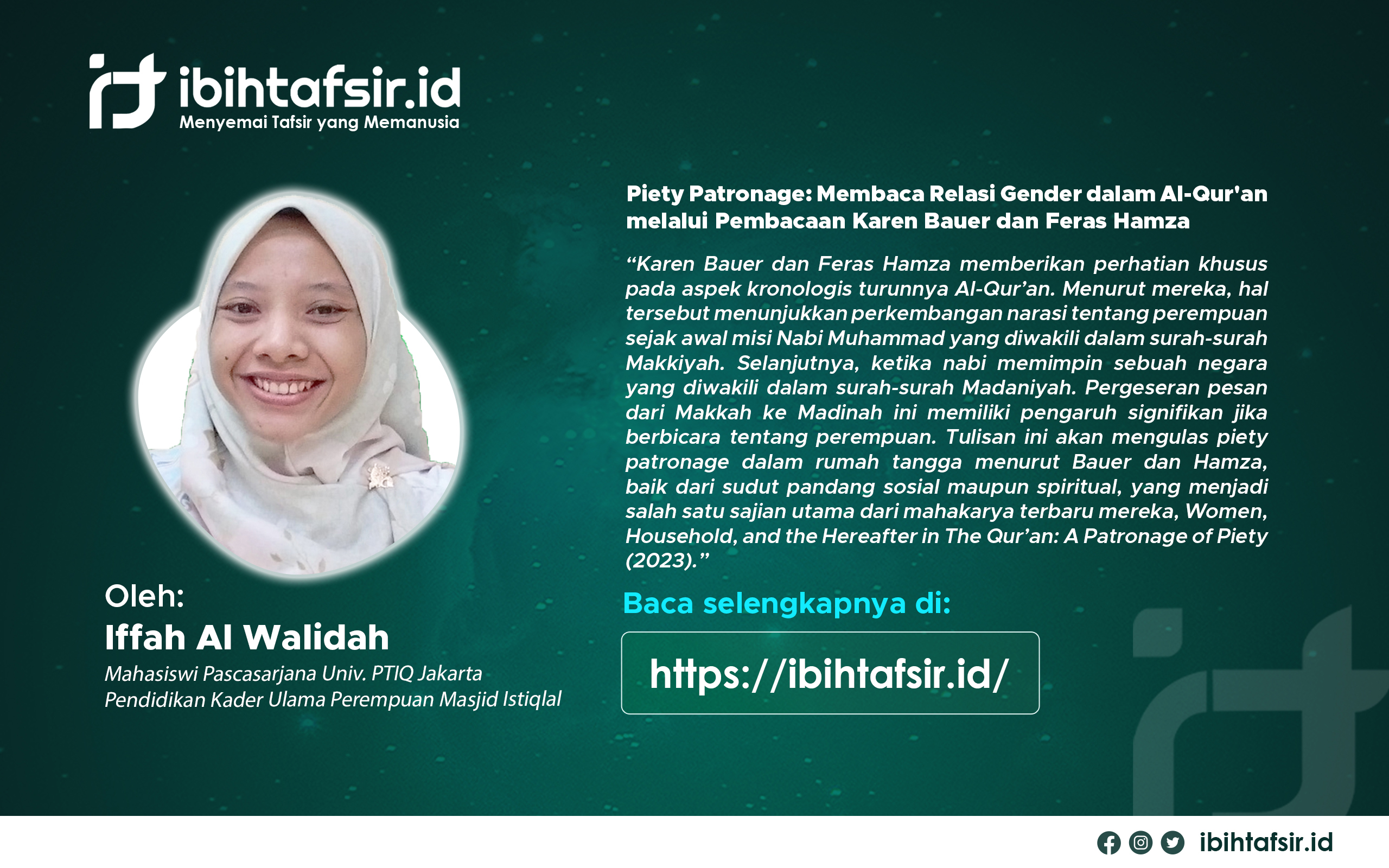 Selain itu, ada kisah-kisah spiritualitas perempuan dalam Al-Qur’an yang dapat dijadikan role model, seperti Maryam putri Imran, Ratu Balqis dari negeri Saba’, istri Fir’aun, dan lain-lain (Mustaqim, 2008). Tulisan ini akan membahas tentang piety patronage yang masuk dalam bagian buku terbaru Karen Bauer dan Feras Hamza yang berjudul Women, Household, and the Hereafter in The Qur’an: A Patronage of Piety.