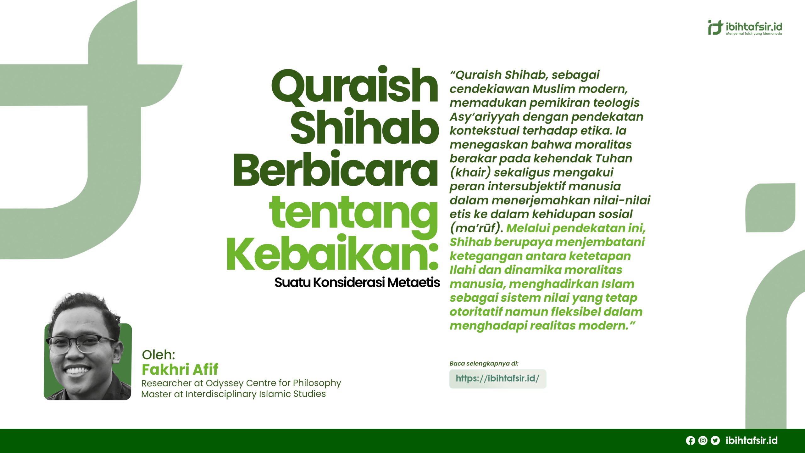 Rekognisi tersebut dapat dipandang sebagai bagian dari usaha negosiatif untuk memediasi ketegangan metaetis antara guided will theory Mu’tazilah (menempatkan baik-buruk sebagai sesuatu yang independen dari Tuhan) dengan divine command theory Asy‘ariyyah (menegaskan dependensi baik-buruk pada kehendak Tuhan). Di akhir, penulis akan menyoroti tafsir Shihab terhadap konsep-konsep etis dalam Al-Qur’an yang termuat dalam QS. Āli ‘Imrān [3]: 104.