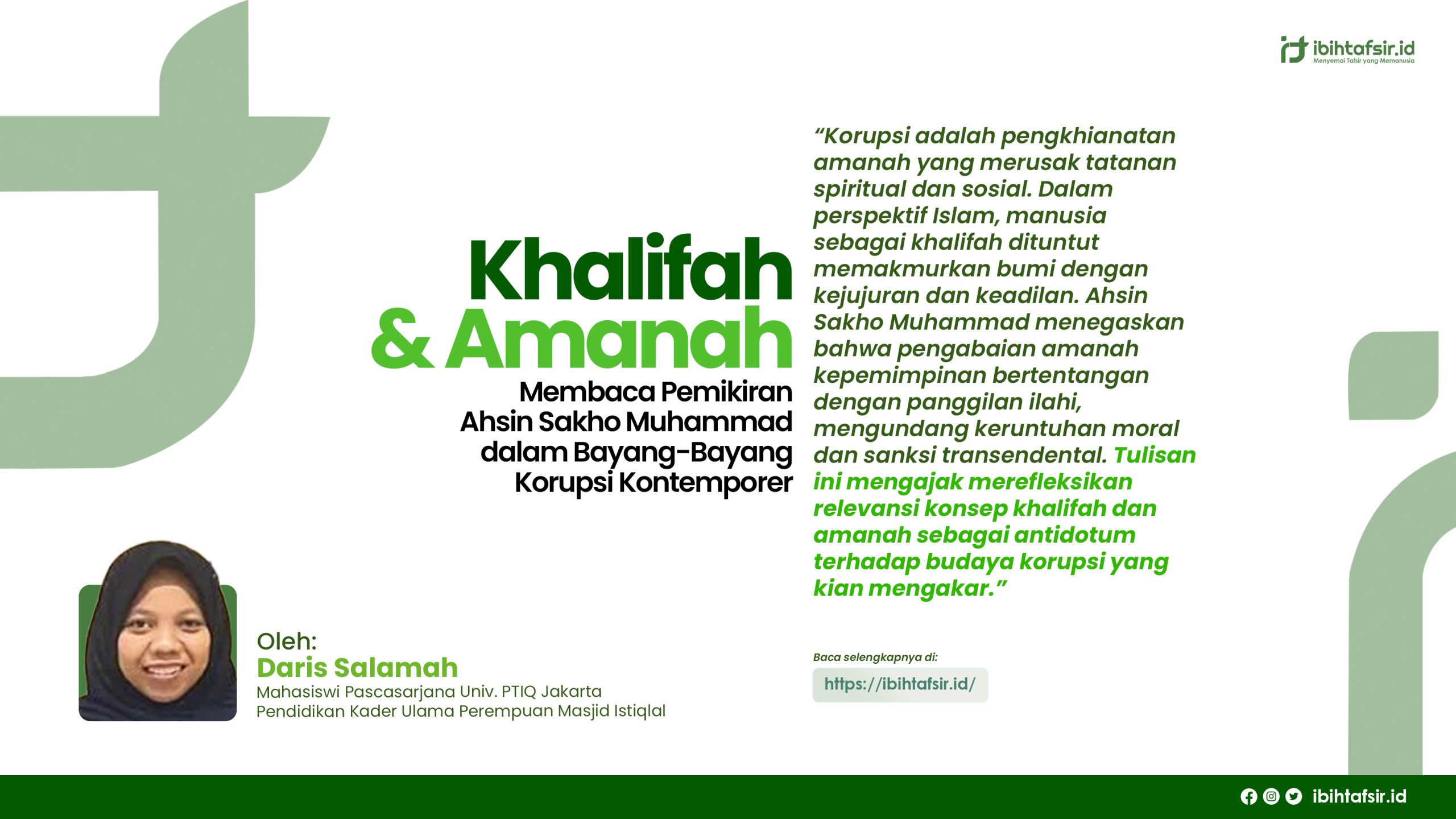 Dalam konteks ini, pemikiran Ahsin Sakho Muhammad menjadi sangat relevan. Sebagai ulama Al-Qur’an yang mendalami Ilmu Qira’at dan Tafsir, beliau menekankan bahwa peran khalifah di muka bumi harus dijalankan dengan penuh tanggung jawab dan amanah. Kepemimpinan yang mengabaikan nilai-nilai ini berpotensi melahirkan ketidakadilan dan menyimpang dari hakikat tugas manusia sebagai pengelola bumi sesuai ajaran Islam.
