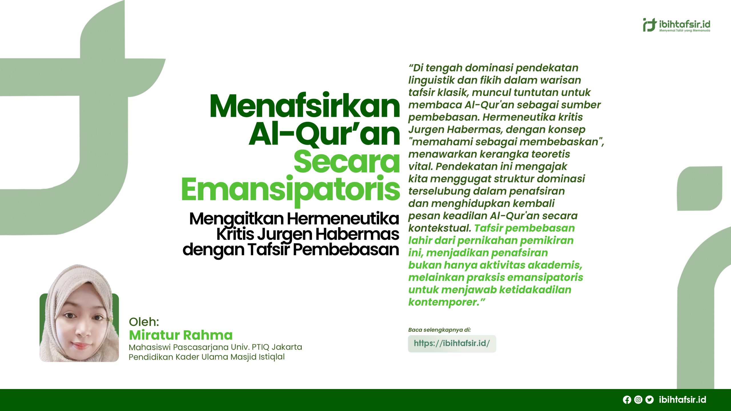 Penafsiran Al-Qur’an selalu menjadi medan dialektika antara teks dan konteks. Dalam sejarah Islam, tafsir klasik cenderung menekankan aspek-aspek yang telah disebutkan sebelumnya (linguistik, fikih, dan teologis). Namun, perkembangan zaman menuntut pendekatan yang lebih kontekstual dan kritis. Di sinilah hermeneutika modern, khususnya pemikiran Jurgen Habermas, menawarkan sumbangan penting dalam menafsirkan Al-Qur’an dengan pendekatan secara emansipatoris: “memahami sebagai membebaskan” (verstehen als befreiung), atau yang sering dikenal sebagai “tafsir pembebasan”.