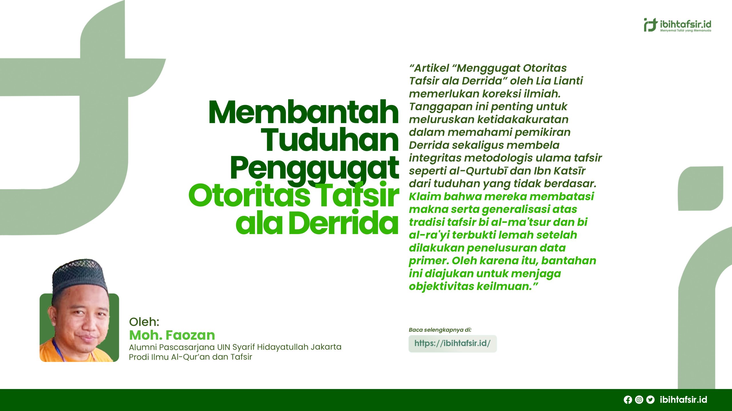 Ada beberapa catatan penting atas artikel “Menggugat Otoritas Tafsir ala Derrida” yang ditulis oleh teman penulis, Lia Lianti (selanjutnya disebut “penggugat”). Artikel ini dimuat dalam ibihtafsir.ID sebanyak 12 paragraf. Artikel ini, terakhir penulis cek telah dilihat sebanyak 315 kali dan mungkin akan terus bertambah. Penulis menilai artikel ini kurang akurat terkait Derrida dan berisi tuduhan-tuduhan tak berdasar atas ulama-ulama tafsir, khususnya al-Qurṭubī dan Ibn Katsīr.