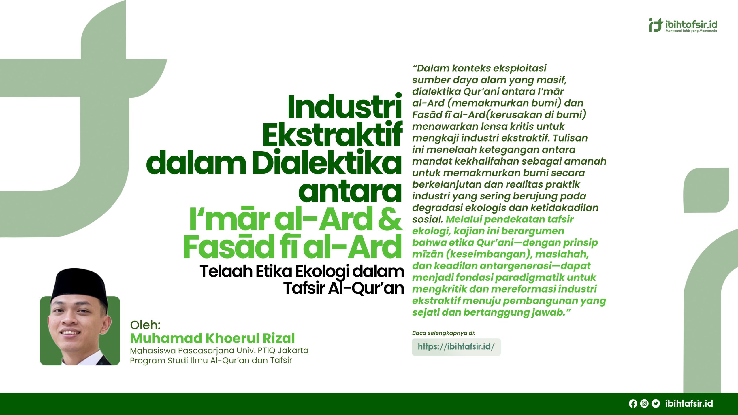 Kajian ini penting untuk menegaskan kembali paradigma pembangunan berlandaskan etika Qur’ani. Melalui tafsir ekologi, tulisan ini menelaah bagaimana konsep I‘mār al-Arḍ dapat menjadi dasar kritik terhadap industri ekstraktif, sekaligus mengarahkan pembangunan menuju keberlanjutan, keadilan, dan tanggung jawab manusia terhadap bumi.