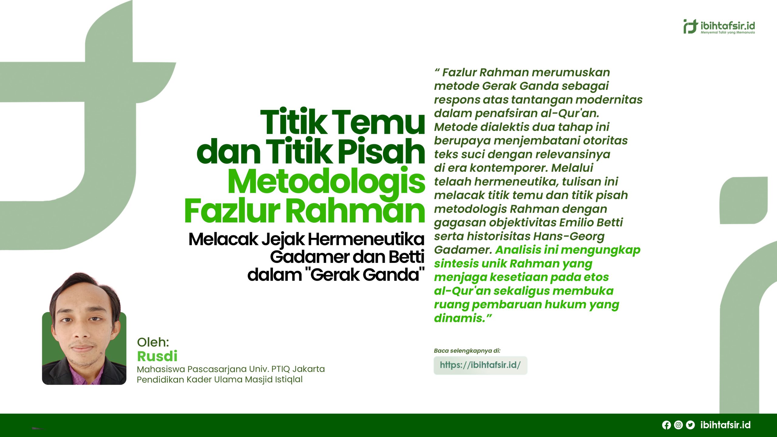 Jadi, Gerak Ganda Fazlur Rahman menyeimbangkan otoritas teks dan relevansi modern; titik temu dengan Gadamer mendukung pembaruan hukum, sedangkan titik pisah dari Betti menjaga prinsip moral. Gerak Pertama menahan subjektivitas, sehingga Gerak Kedua tetap etis dan dinamis.