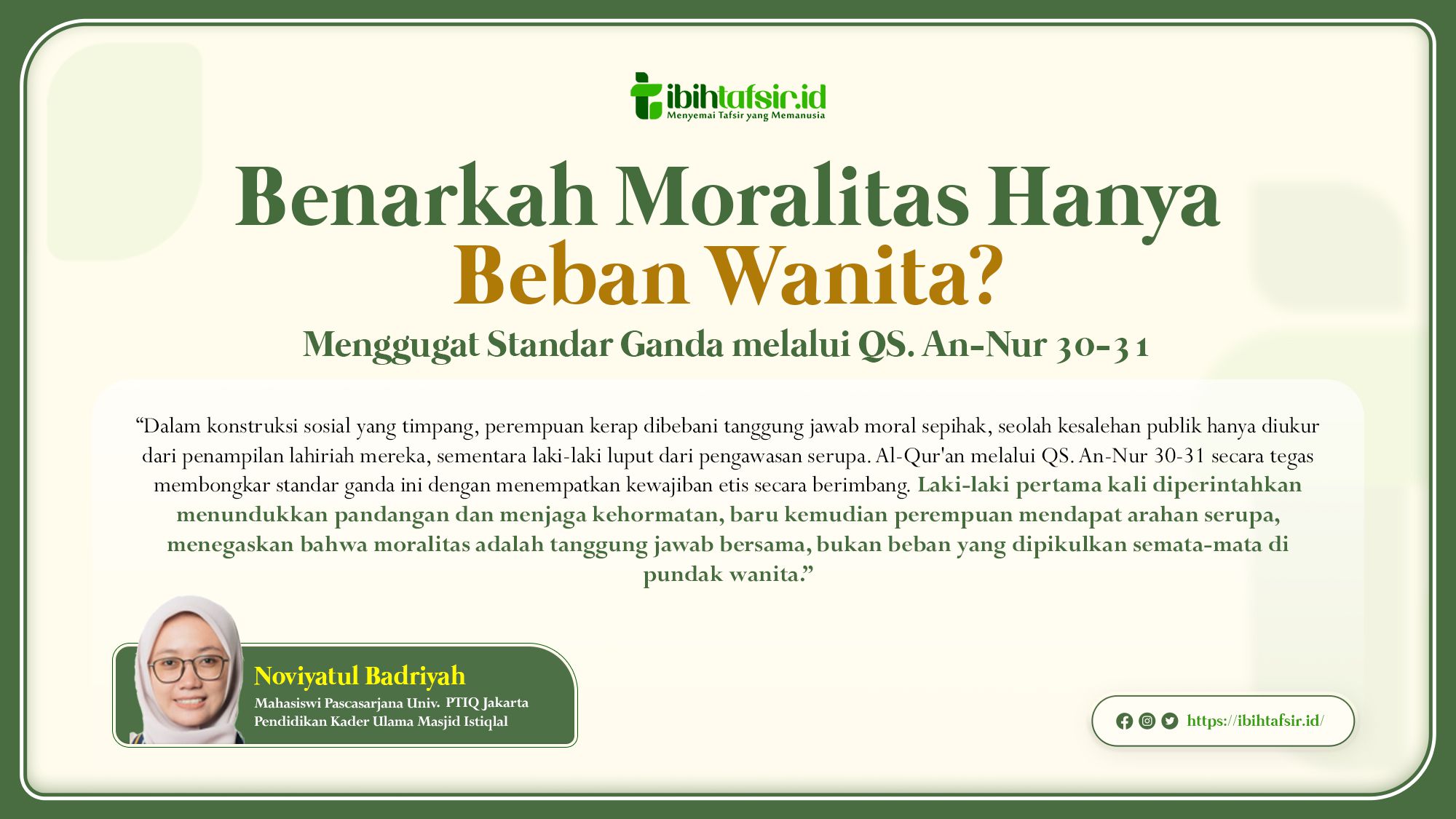 Dengan demikian, perempuan tidak dibebani peran sebagai “penjaga” atau “pengaman” bagi nafsu lawan jenis, melainkan dipanggil untuk merawat kehormatan dirinya demi pertumbuhan iman dan kedekatan spiritual kepada Allah. Pesan ini sekaligus menegaskan prinsip keadilan moral dalam Islam, di mana tanggung jawab etis dibagi secara proporsional dan tidak ditimpakan secara sepihak hanya kepada perempuan.