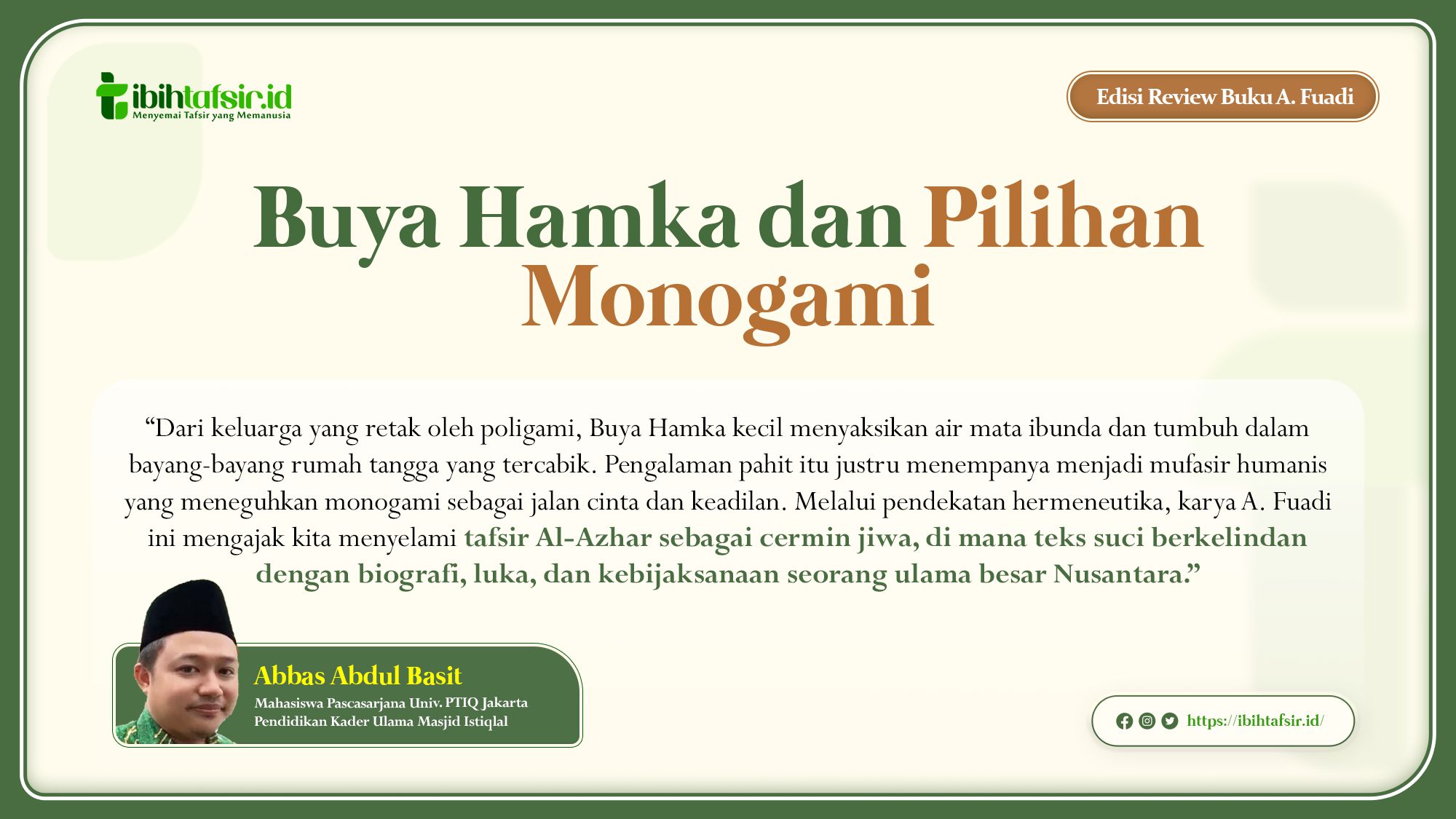 Buku Ayat-Ayat Monogami Buya Hamka karya A. Fuadi hadir sebagai jembatan antara tafsir klasik dan pergulatan isu kontemporer. Dari sampul hingga judulnya, ia mengundang tanya: bagaimana mungkin Buya Hamka, ulama besar yang tumbuh dalam kultur poligami, justru menampilkan wajah humanis dengan meneguhkan monogami sebagai jalan cinta dan keadilan rumah tangga?
