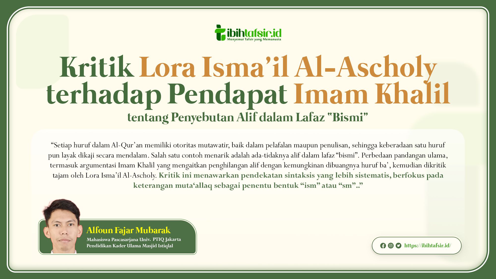 Tulisan ini berfokus pada analisis argumentasi Imam Khalil mengenai penyebutan dan penghilangan alif dalam lafaz “bismi”, sekaligus mengkaji kritik yang diajukan oleh Lora Isma’il Al-Ascholy, seorang mufassir dan anggota majlis keluarga Pondok Pesantren Syaichona Moh. Cholil Bangkalan dalam karyanya The Qur’anything, khususnya dalam penafsiran Surah Al-‘Alaq ayat 1–5.